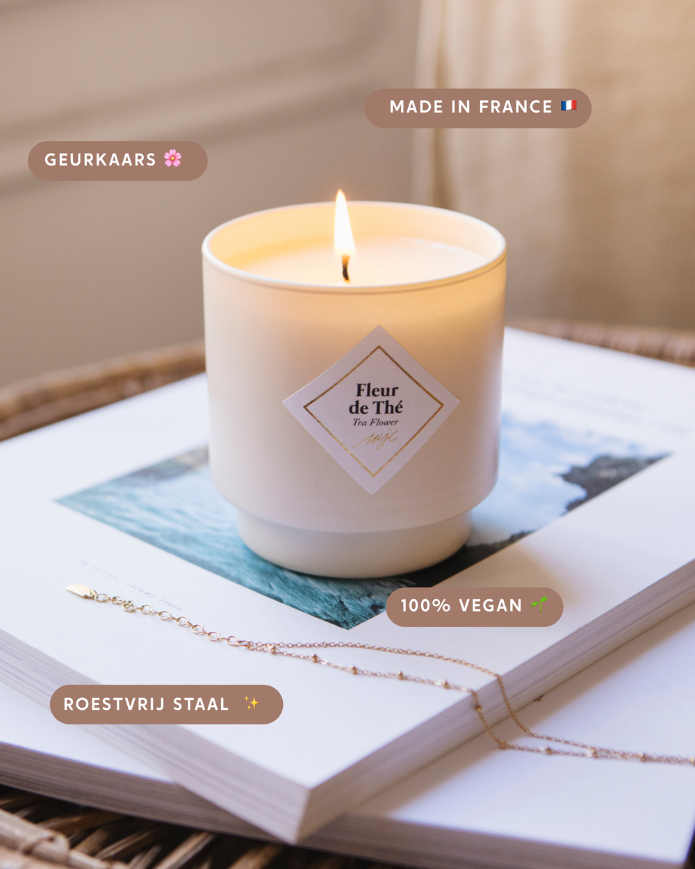 Ingredienten : Plantaardige was, lont van natuurlijke katoenvezels, armband van gerecycleerd roestvrij staal en verguld met fijn goud.